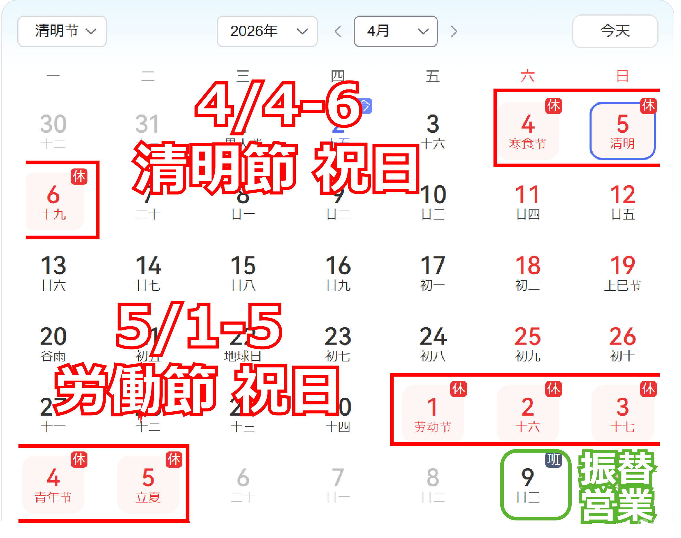 ★26年 清明節 営業体制のお知らせ★4/4(土)~6(月) 休業★