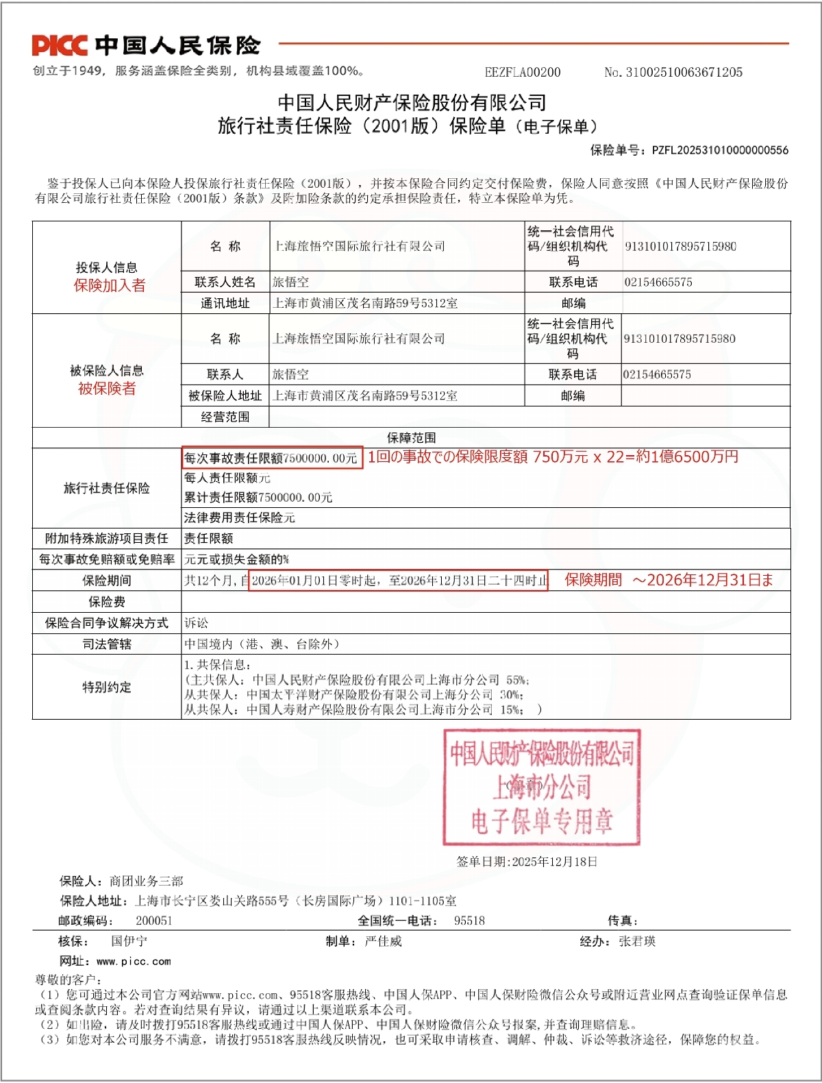 ※上記は海外旅行取扱旅行社の強制保険となります。(皆様の安全の為、旅行社の保険内容は必ずご確認下さい) |