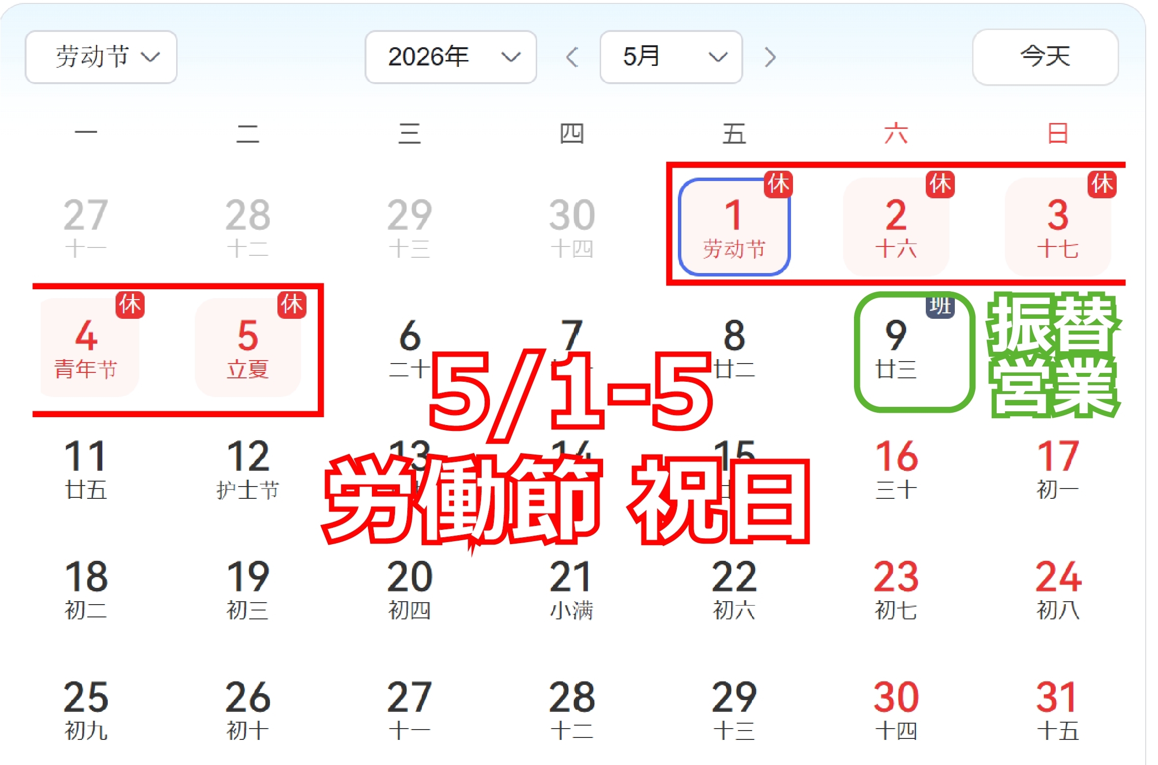 何卒ご理解のほどお願い申し上げます。 ーーーーーーーーーーーーーーーーーーーーーーーーーーーーーー 【労働節 GW における営業体制のご連絡】